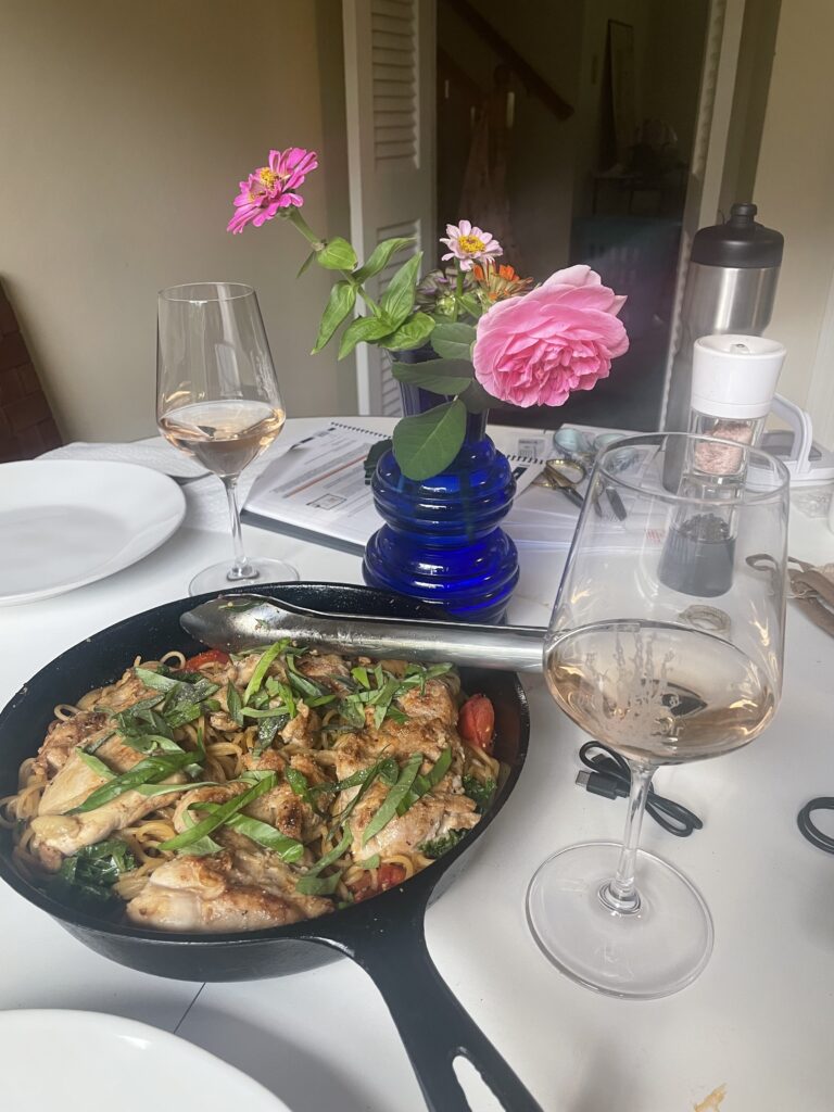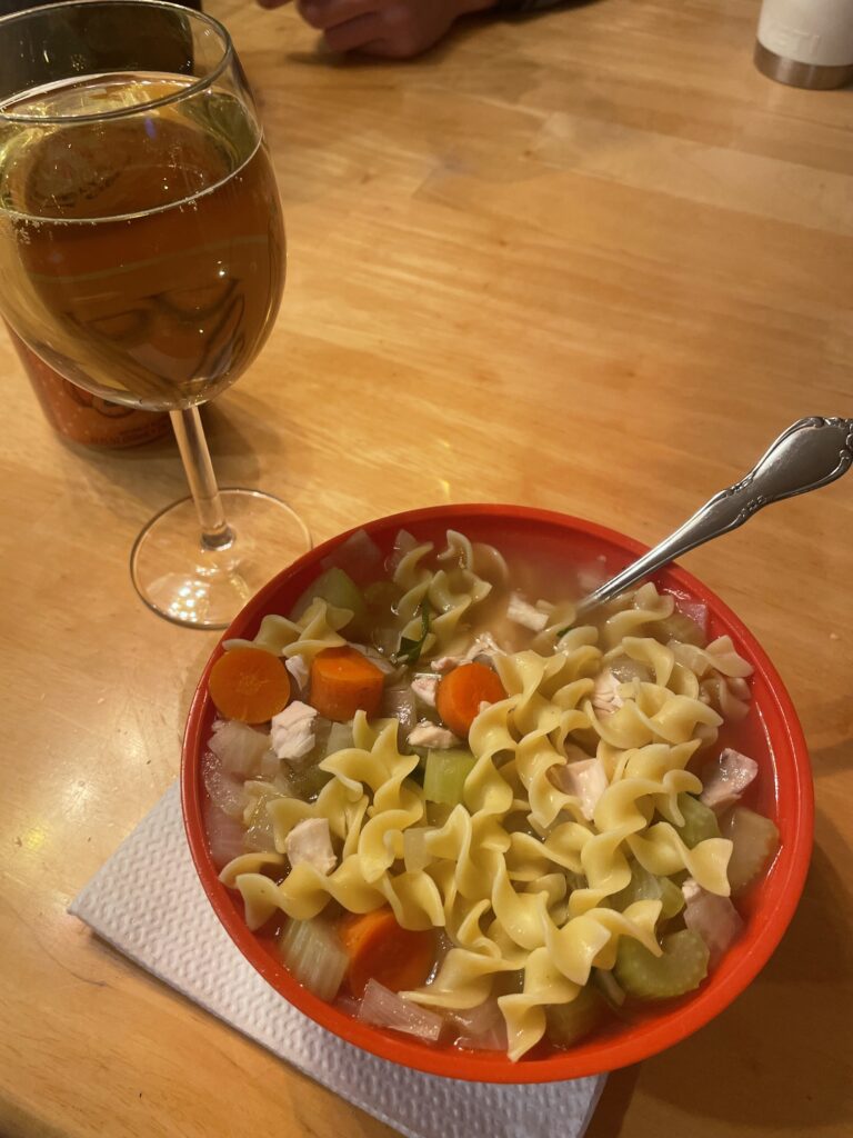 If you give me a Costco rotisserie chicken, I will make a chicken noodle soup. I pretty much measure this by heart at this point, so no exciting recipe here. Not sure if white wine is the right pairing here, but I liked it. Thanks to my dad for filling my glass very full.