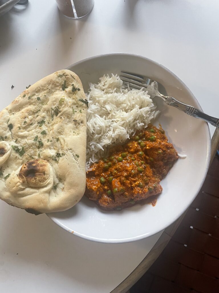 Matar paneer! I’m obsessed with paneer. Whenever I have extra milk that’s about to turn or find a gallon nearing its sell by date marked down to like $1, I’ll pick it up and make paneer. It doesn’t require anything more than milk, vinegar, a light towel or cheesecloth and a few minutes. This is the recipe I learned from. When I haven’t had time to make it ahead and freeze it, I grab out some of the Trader Joe’s garlic naan to go with it.
