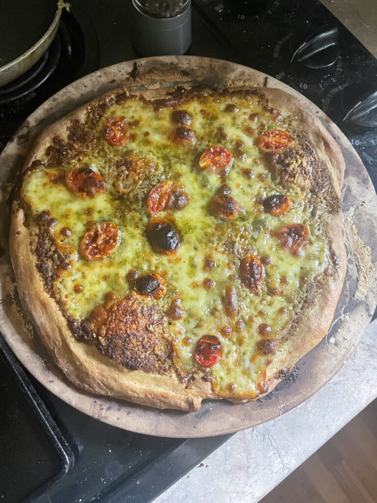 Sourdough pizza crust became a staple in our kitchen this summer. This one had a pesto base from all the basil I grew.