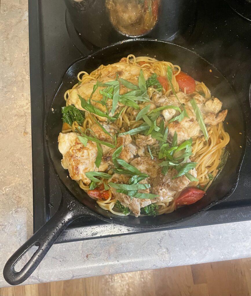Another very Italian-inspired dish in July to use up some of the garden tomatoes and basil. I love this time of year, and I just made this pasta with burst cherry tomatoes, red pepper flakes, parmesean and chicken thighs quickly for a Friday dinner.