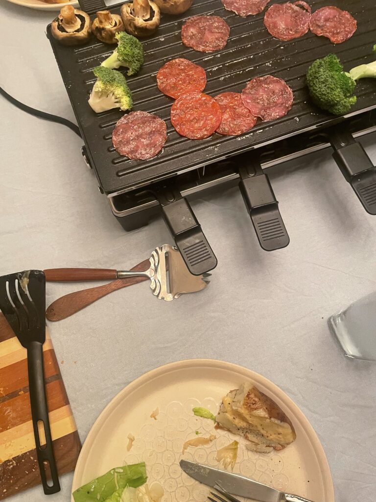 Raclette night for my husband’s birthday! If you like cheese, you’d love raclette. It’s also a great group activity — it’s talkative, interactive and a great crowd pleaser. I usually make a sourdough baguette and some roasted potatoes, parcooked broccoli, asparagus and mushrooms. Then, we’ll do some sausages, salami, and other meats. A salad on the side lightens things up. If you’re interested in a full breakdown of how we do raclette, let me know in the comments!